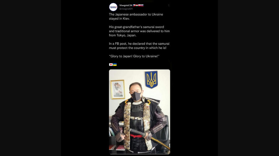 Does a viral photo show the Japanese ambassador to Ukraine dressed as a samurai? No, that's not true: The photo depicts the Ukrainian ambassador to Japan: Sergiy Korsunsky. Korsunsky posted the photo to social media ahead of Russia's invasion of Ukraine.