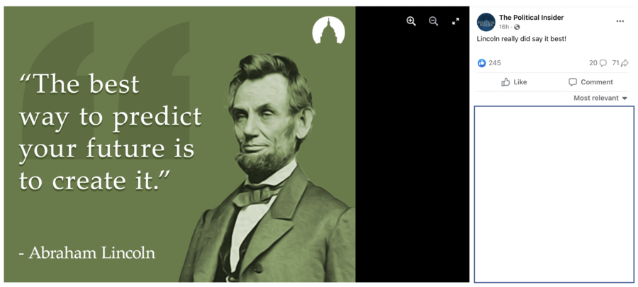 Did Abraham Lincoln, the 16th president of the U.S., advise the public on how to predict the future by suggesting that they should create it, instead? No, that's not true: The quote is not authentic, the Abraham Lincoln Presidential Library confirmed to Lead Stories.