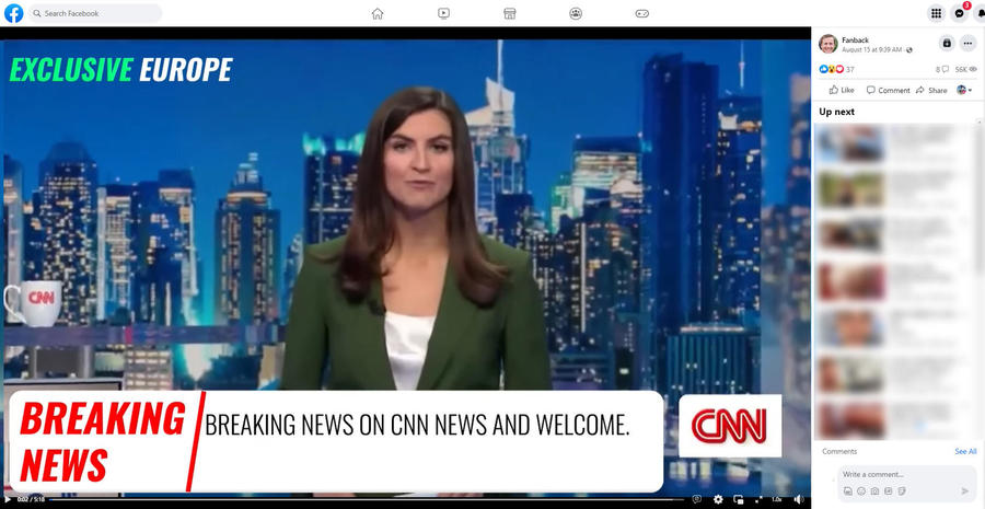 The video spoofing a CNN broadcast (archived here) with anchor Kaitlan Collins was posted in an ad campaign on Facebook by the page Fanback on August 15, 2023. The post has no caption.
