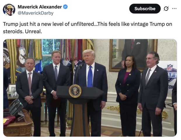 The claim appeared in a post (archived here) shared on X by @MaverickDarby on May 6, 2025, under the title "Trump just hit a new level of unfiltered...This feels like vintage Trump on steroids. Unreal.". It opened: