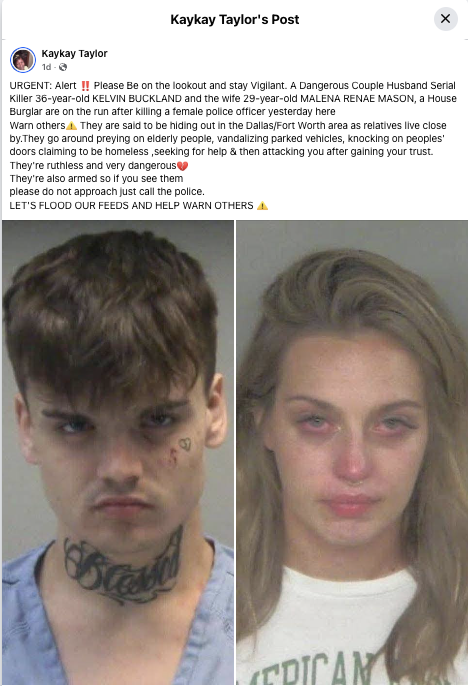 URGENT: Alert ‼️ Please Be on the lookout and stay Vigilant. A Dangerous Couple Husband Serial Killer 36-year-old KELVIN BUCKLAND and the wife 29-year-old MALENA RENAE MASON, a House Burglar are on the run after killing a female police officer yesterday here Warn others⚠️ They are said to be hiding out in the Dallas/Fort Worth area as relatives live close by. They go around preying on elderly people, vandalizing parked vehicles, knocking on peoples' doors claiming to be homeless ,seeking for help & then attacking you after gaining your trust. They're ruthless and very dangerous💔 They're also armed so if you see them please do not approach just call the police. LET'S FLOOD OUR FEEDS AND HELP WARN OTHERS ⚠️