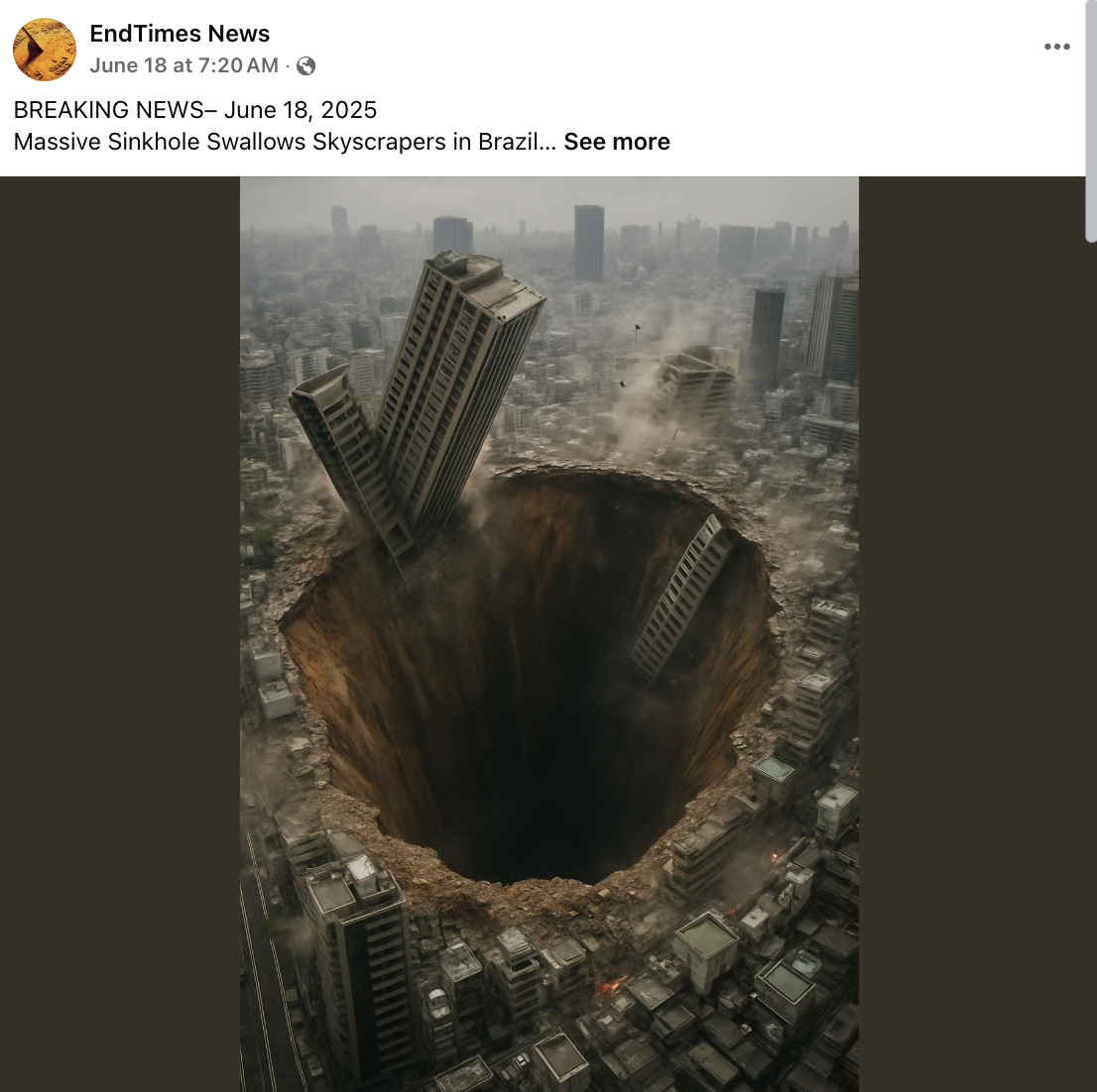 For example, a June 18 post contained descriptions of a "massive sinkhole" "swallowing" skyscrapers in Sao Paolo, Brazil -- an event that simply never occurred -- and illustrated that post with a blatantly AI-generated image: