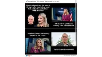 Did actor Robert De Niro call White House Press Secretary Karoline Leavitt "KKKatherine" and did she respond that her family "fought to end slavery" while his "snuck into the country illegally in the 1920s"? No, that's not true: A meme describing that supposed exchange originated on a Facebook page with a satire disclaimer. The owner of the page is known for tricking conservatives into liking and sharing made-up content.