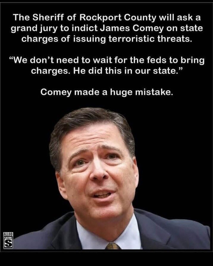 Did the Rockport County Sheriff say he would ask a grand jury to indict former FBI director James Comey on state terroristic threats charges? No, that's not true: A meme making that claim originated on a Facebook page with a satire disclaimer. The owner of the page is known for tricking conservatives into liking and sharing made-up content. Also, there is no Rockport County in the United States.