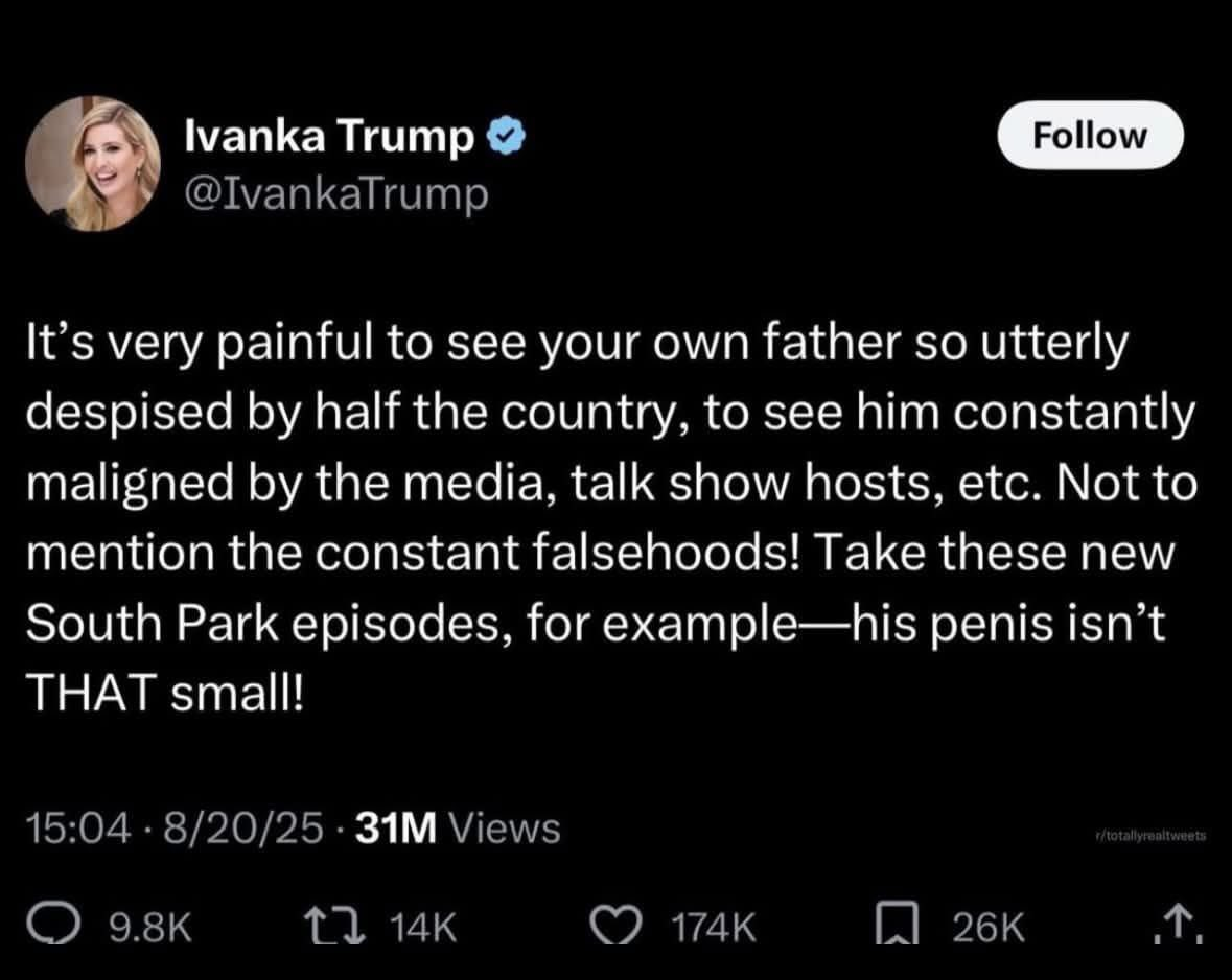 Did Ivanka Trump publish a post on X saying it is "painful to see your own father" being "utterly despised" and complaining about the depiction of his penis size on South Park? No, that's not true: A viral screenshot that appeared to show a post with the phrase "his penis isn't THAT small" was falsified. No such message appeared on Ivanka's X account and Google did not index one either.