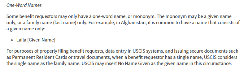 The DMV uses an applicant's name exactly as it appears in those documents. When the applicant's name is a mononym, the DMV must still fill in the digital blank where a first name would have otherwise be listed. Putting "NO NAME GIVEN" in that space is the official procedure.