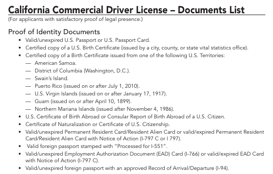 California requires proof of identity, as well as "satisfactory proof of legal presence" for a commercial driver's license. The list (archived here) of acceptable documents for American citizens include a valid U.S. passport or certified U.S. birth certificate, or several other certified official documents. Non-citizens can also obtain CDLs, but they need to show a valid foreign passport, a permanent resident card or similar federally-issued documents.