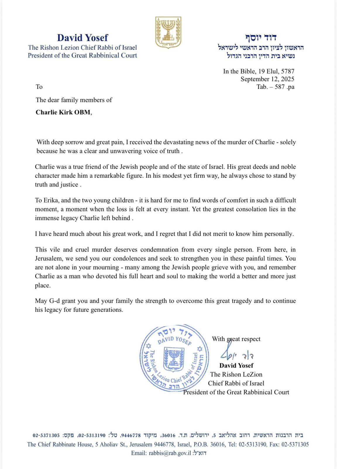 Did Israel's Chief Rabbi, David Yosef, write a condolence letter to the family of Charlie Kirk on September 2, 2025 -- more than a week before Kirk was killed? No, that's not true: The letter was written on Sept. 12, 2025, but it was shared publicly online with a typing error -- it was dated September 2, 2025. In an email to Lead Stories, the office of the Chief Rabbi said this was a technical error in typing, and emphasized that the letter was written on September 12th.