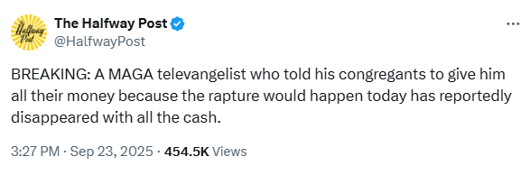BREAKING: A MAGA televangelist who told his congregants to give him all their money because the rapture would happen today has reportedly disappeared with all the cash.