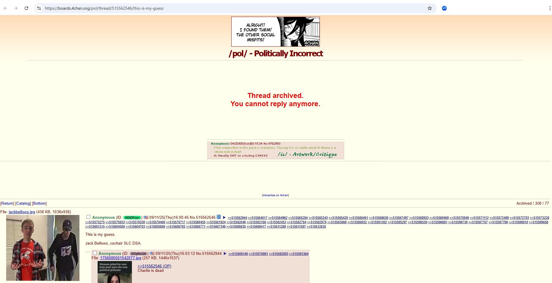 At the time of writing, Sep. 12, 2025, the suspect had been identified as 22-year-old Tyler Robinson, and he had been taken into custody. But on Sep. 11, 2025 the identity of the suspect was still a mystery. A user on 4chan's /pol/ (Politically Incorrect) forum made a post (archived here) including a photo of Bellows and security camera photo for comparison. It read: