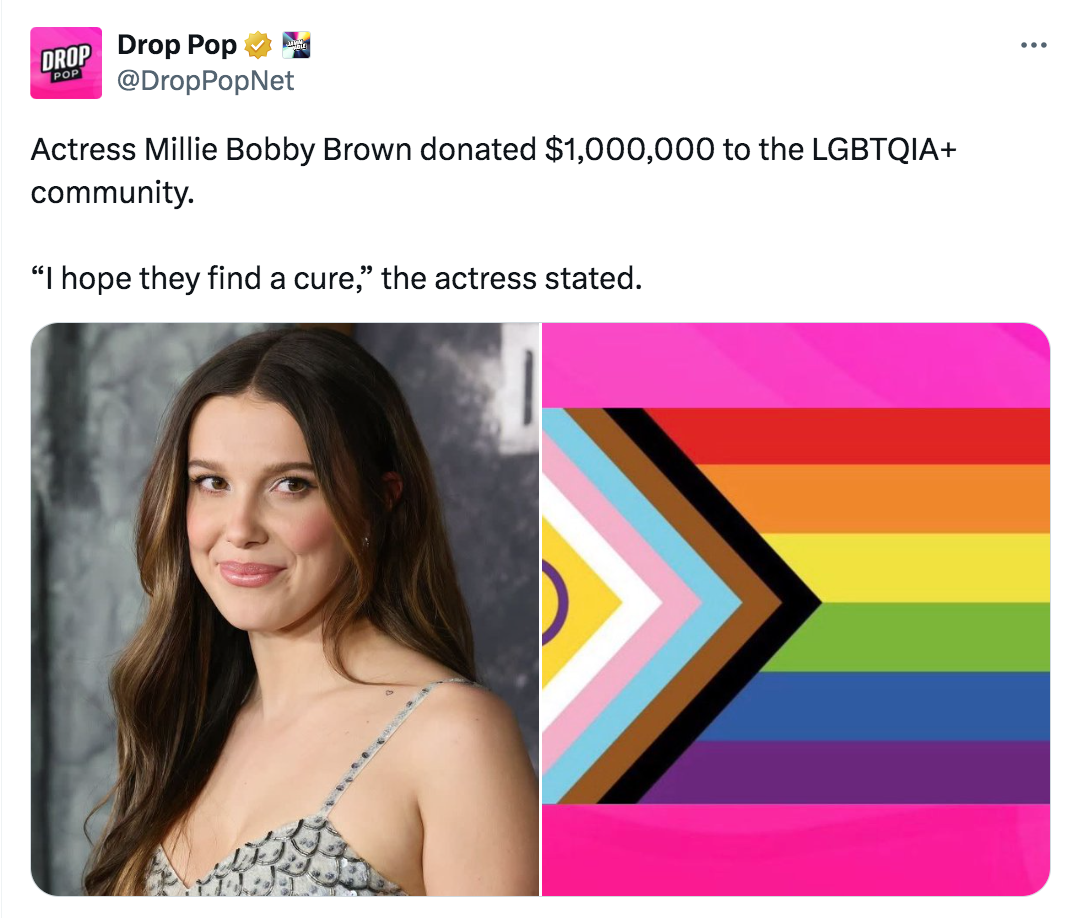 Did actress Millie Bobby Brown donate $1 million to the LGBTQIA+ community hoping they would "find a cure?" No, that's not true: The account that posted the message is self-described as a parody account. The account disclaimer reads: "all content is satirical and not factual."