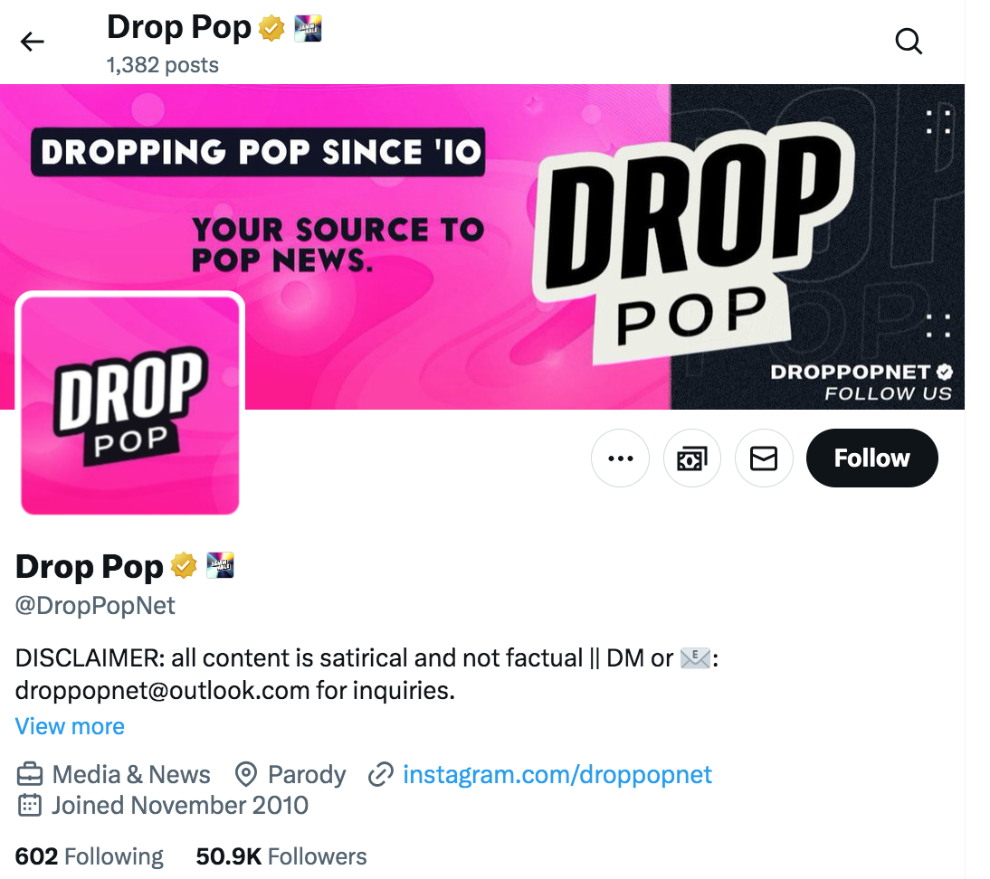 The X.com account @DropPopNet (archived here) that posted the message about the Stranger Things star is clearly labeled a parody as this screenshot shows: