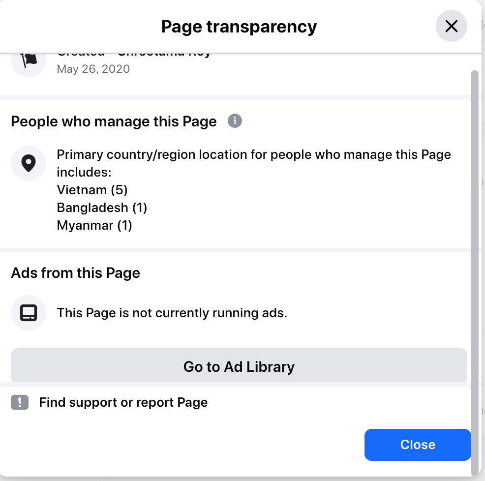 The page transparency tab of the "Shreetama Roy" Facebook page (archived here) indicates it is being managed from Vietnam, Bangladesh, and Myanmar as this screenshot shows: