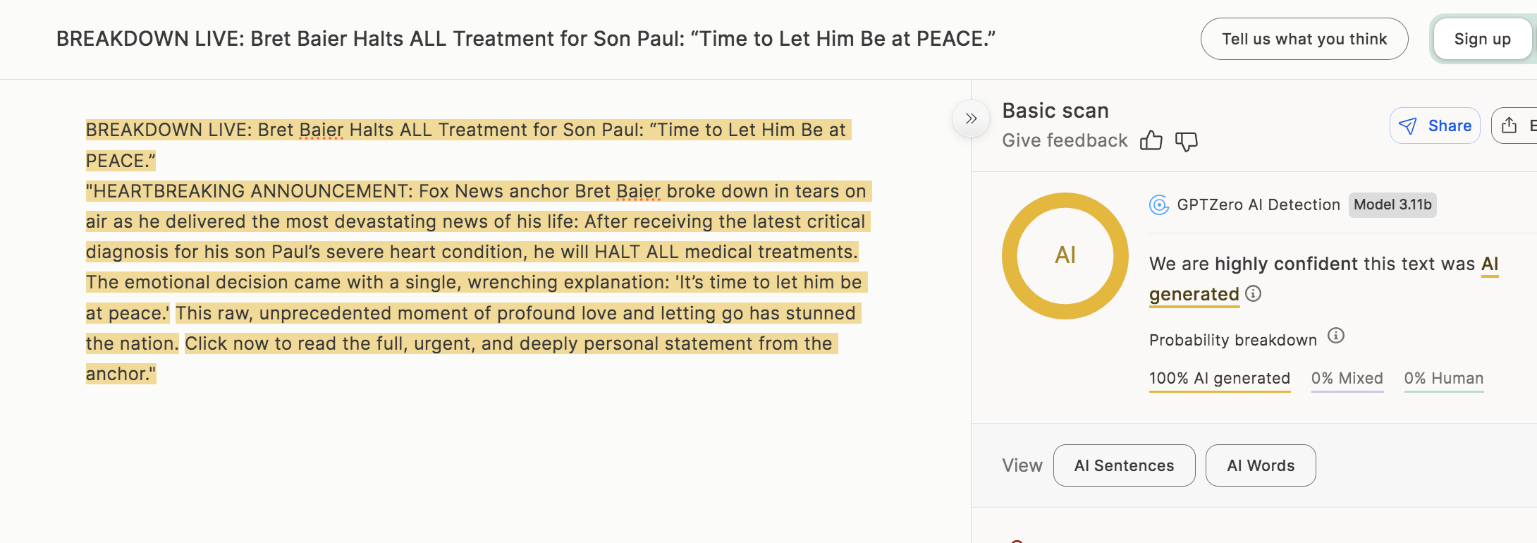 Did Bret Baier announce he would "halt all treatment" for his son Paul? No, that's not true: A FOX News spokesperson told Lead Stories this claim is false. Baier has made no such statement that he decided to "halt all treatment" for his son Paul, who was born with five congenital heart defects and had emergency open heart surgery in 2024. The story, from a fake news site, was promoted by a Facebook page managed from Vietnam, Bangladesh, and Myanmar.