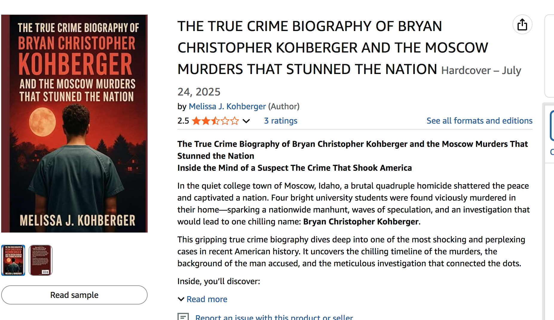 The book with the author Melissa J. Kohberger is titled, "The True Crime Biography of Bryan Christopher Kohberger and the Moscow Murders that Stunned the Nation" by a "Melissa J. Kohberger."