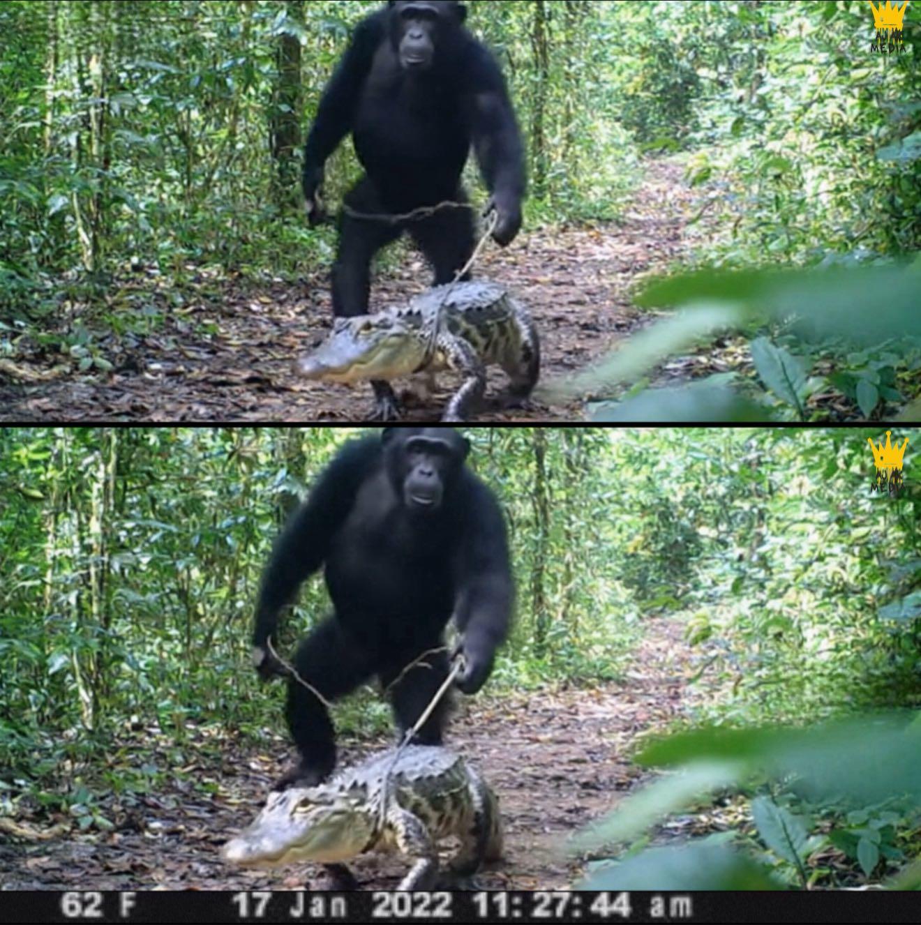 The two images with different natural lighting conditions have some deceptively realistic details. The realism of the slightly out of focus chimps moving along well worn paths in the forest is paired with the outlandish element that the chimps are wearing well constructed face coverings made of natural forest materials. It might appear that these are two stand alone images included in the same post but it is actually one composite image. Along the bottom edge (visible above) there is a black margin with some partially legible numbers -- an effect suggesting this is a real image file from a digital camera. Attention to the other posts on this page show that it is part of the deceptive formula.