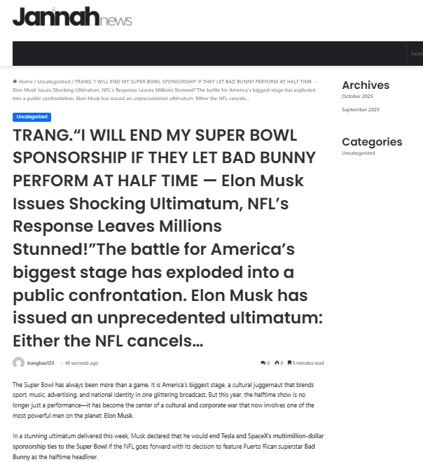 Did Elon Musk threaten to end his Super Bowl sponsorship if Bad Bunny performs at the halftime show? No, that's not true: Elon Musk does not sponsor the Super Bowl. The claim that he does and has threatened to end his sponsorship was published and promoted by a network of clickbait websites and Facebook page operated from Vietnam. The same network has produced many other false claims about the Bad Bunny and the Superbowl to gain web traffic for money.