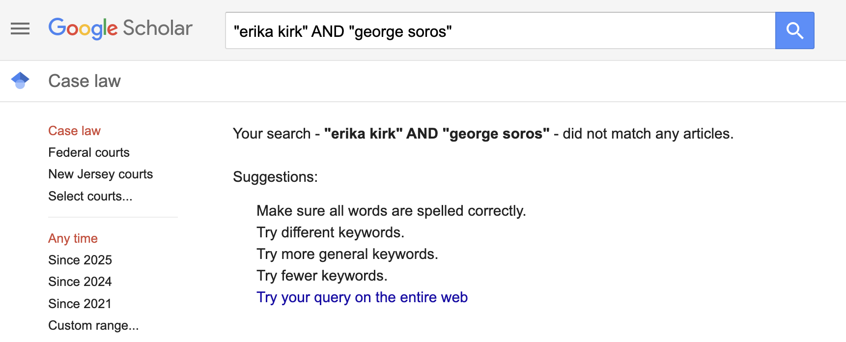 A broad search for the names of Erika Kirk and Soros on Google Scholar's case law (archived here) yielded no lawsuits, either: