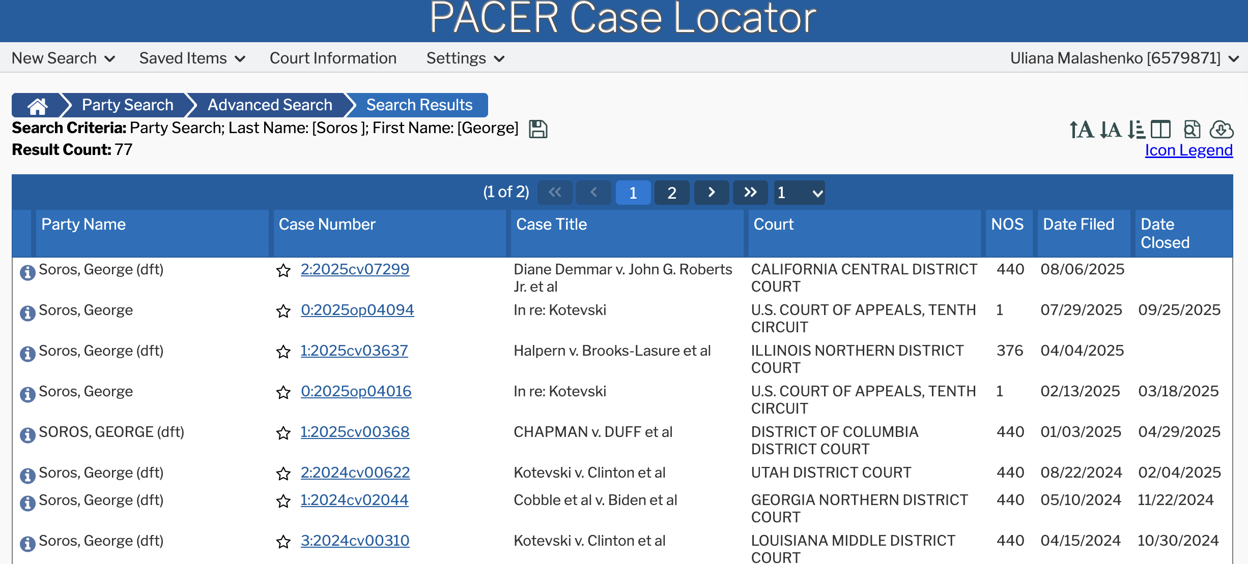 Had the rumor been true, there would have been official court documents confirming it. However, searches across the Public Access to Court Electronic Records portal (PACER) did not show any recent lawsuits against Soros that wouldn't predate Charlie Kirk's death (archived here) on September 10, 2025: