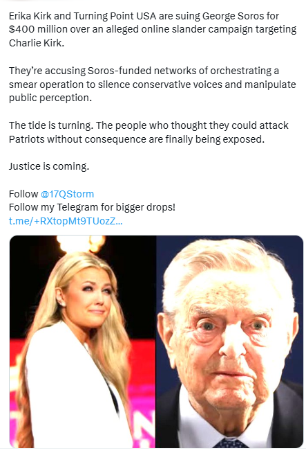 Erika Kirk and Turning Point USA are suing George Soros for $400 million over an alleged online slander campaign targeting Charlie Kirk. They're accusing Soros-funded networks of orchestrating a smear operation to silence conservative voices and manipulate public perception. The tide is turning. The people who thought they could attack Patriots without consequence are finally being exposed. Justice is coming.
