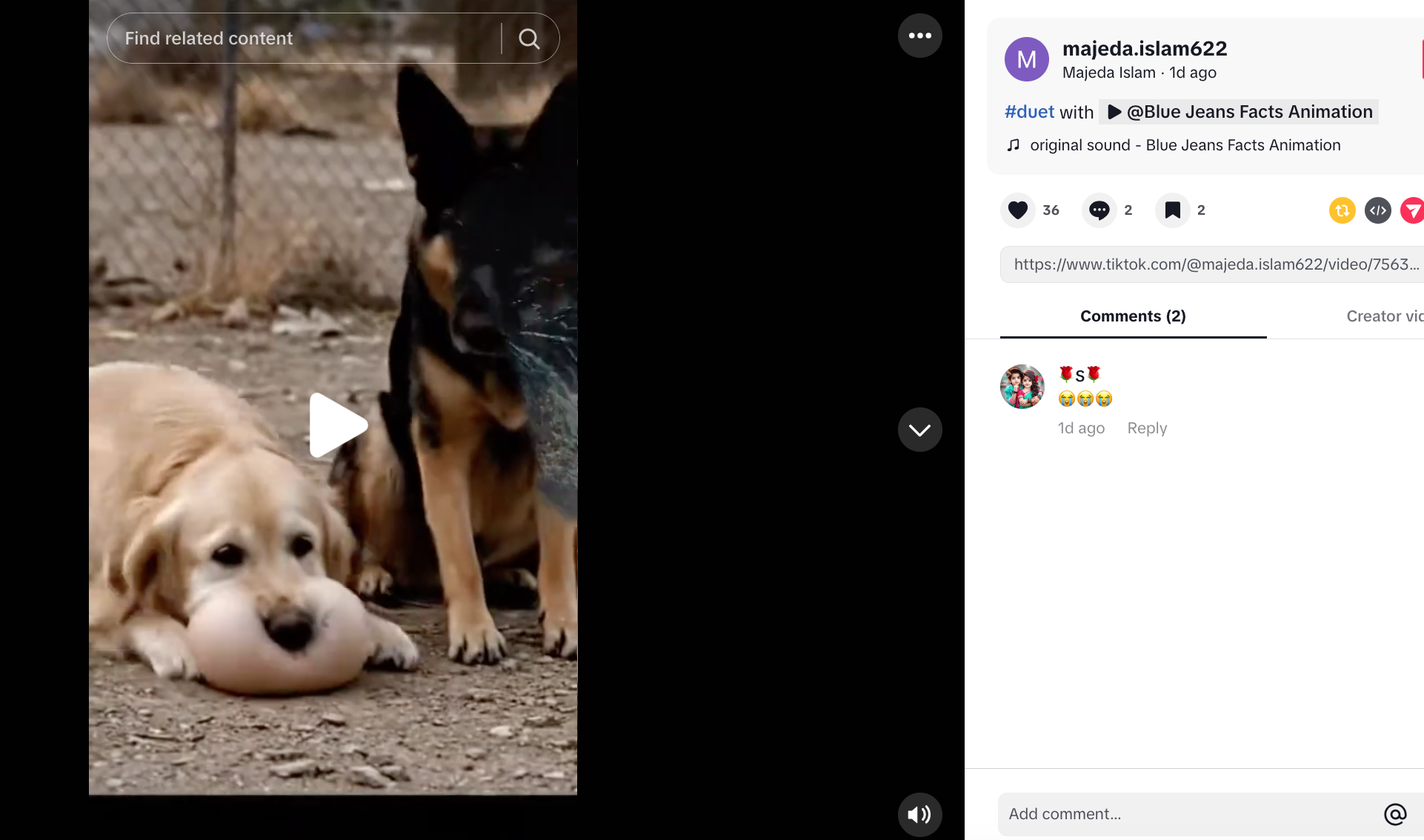 The video appears to be a "duet" (a video created alongside another user's video) between the accounts @majeda.islam622 and @bluejeansanimation as this screenshot shows: