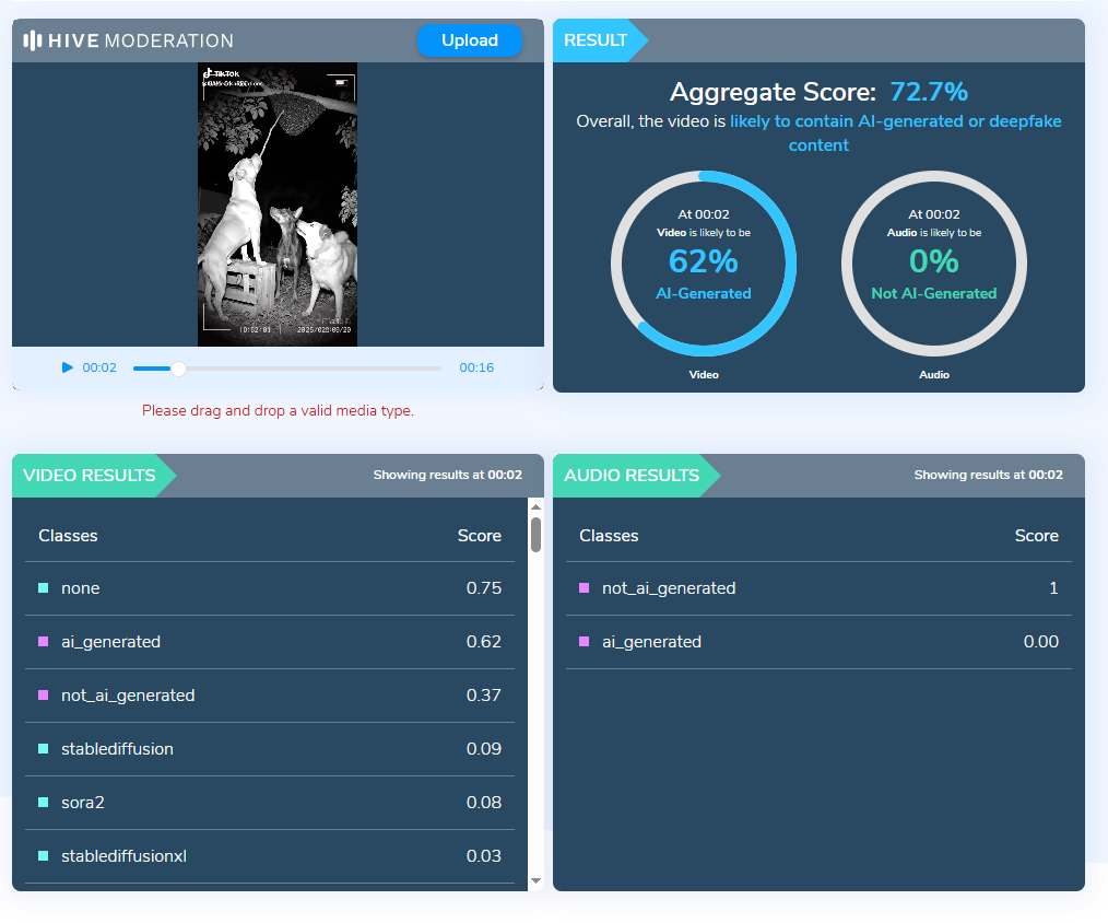 To find out if this was a "true" story, Lead Stories ran the video through AI detection tool Hive, which said it was 72.7% likely the image contained AI-generated or deepfake content, as this screenshot shows: