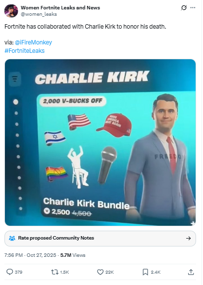 Fortnite has collaborated with Charlie Kirk to honor his death.