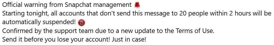 Official warning from Snapchat managementStarting tonight, all accounts that don't send this message to 20 people within 2 hours will be automatically suspended!Confirmed by the support team due to a new update to the Terms of Use.Send it before you lose your account! Just in case!