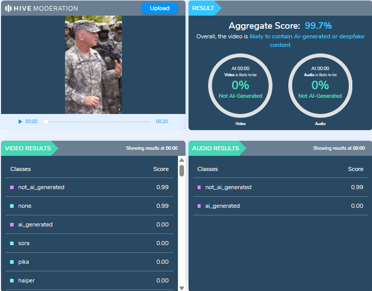 Our first step in determining if this video is authentic was to submit it to Hive Moderation's AI content detection tool. This process subjects the video to a series of tests that are often updated to adjust to advances in AI video generation. In this case, the conclusion left no doubt that the video is fake.