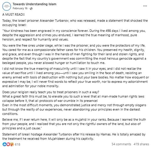 A MUST READ!!Today, the Israeli prisoner Alexander Turbanov, who was released, made a statement that shocked the occupying Israel:"Your kindness has been engraved in my conscience forever. During the 498 days I lived among you, despite the aggression and crimes you endured, I learned the true meaning of manhood, pure heroism, and respect for humanity and values.