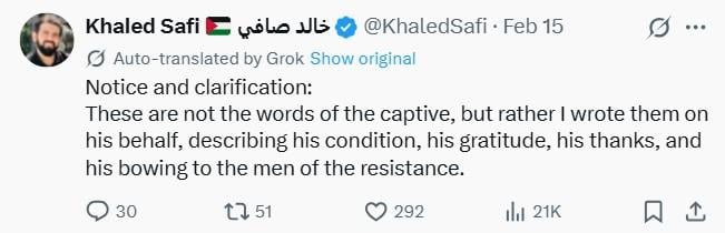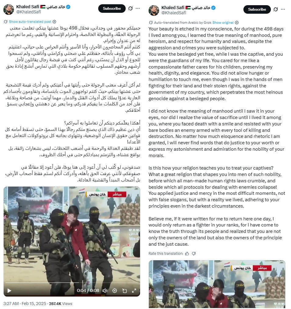 On Feb. 15, 2025 Khaled Safi @KhaledSafi made a post (archived here) on X in Arabic (pictured below left). The post included an 8-second video clip showing Troufanov in the same setting as the photo above- escorted by two armed fighters. Although not identical, the auto-translation of Safi's post to English (pictured below right) follows the structure and sentiment of the quote included in the Facebook post.