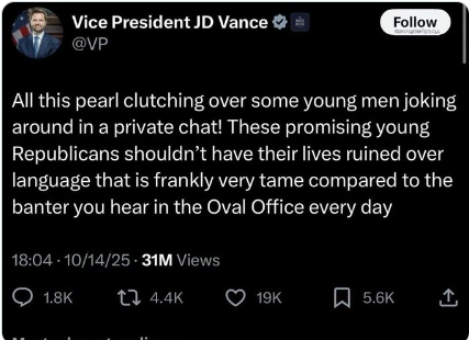 In mid-October 2025, JD Vance's remarks about the contents of the conversations in a Republican group on Telegram made headlines. In part, he suggested (archived here) that the comments were made by "kids" and "young boys".