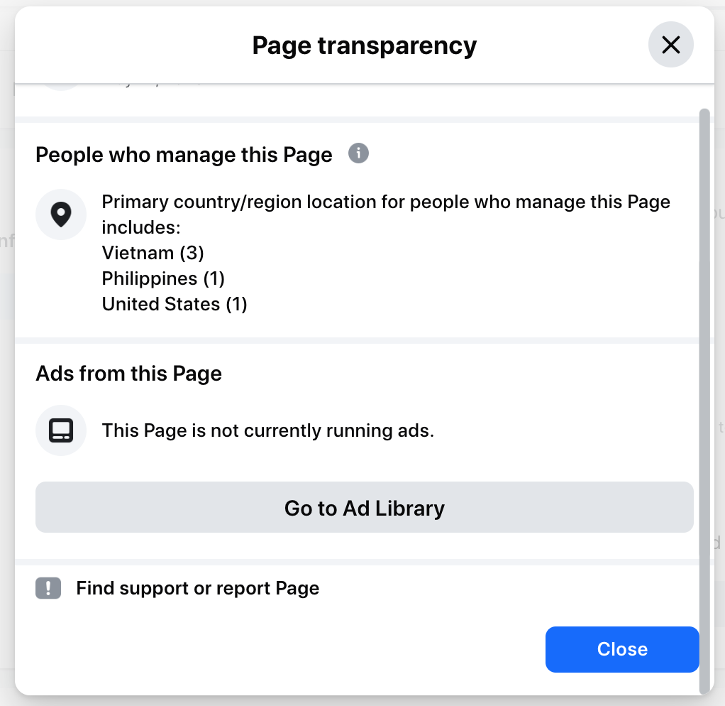 The page transparency tab of the "Avril Uncovered" Facebook page (archived here) indicates it is being managed from Vietnam, Philippines, and the United States as this screenshot shows: