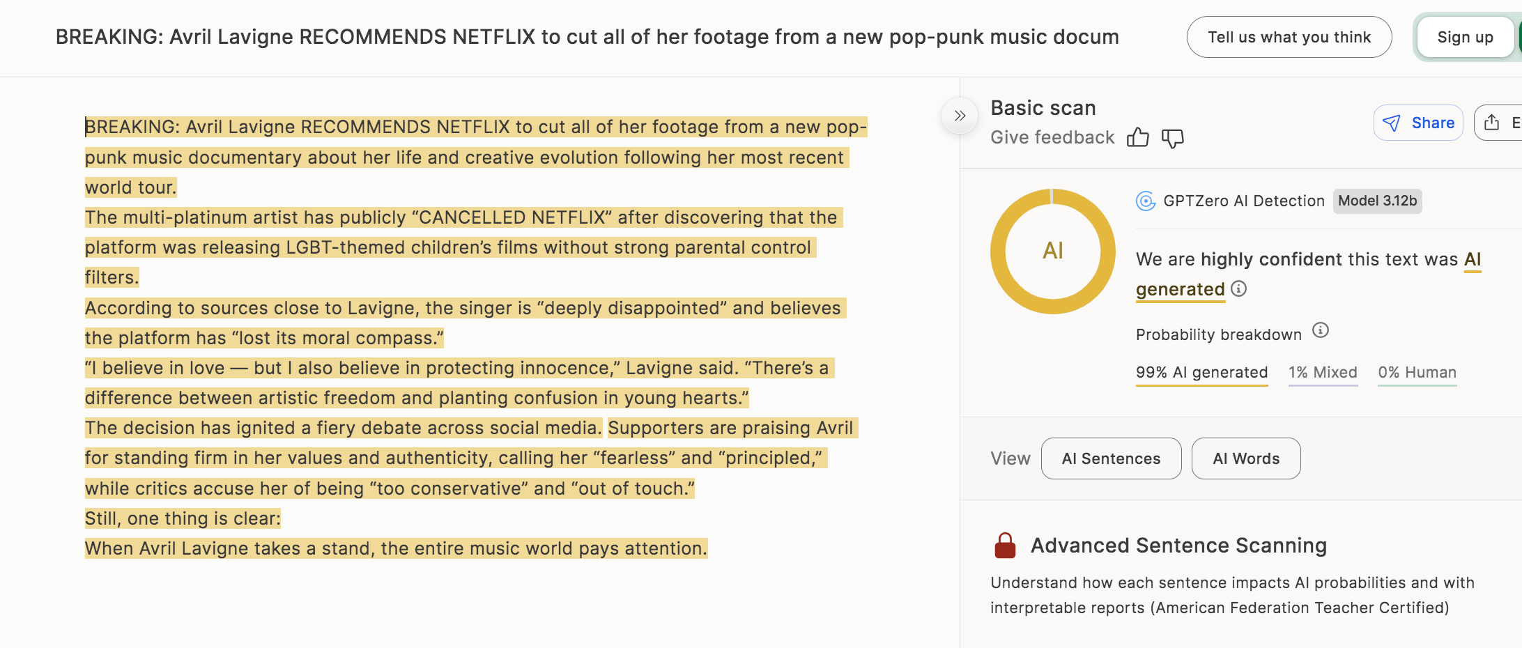 (Image Source: GPTZero.me website screenshot taken by Lead Stories.)