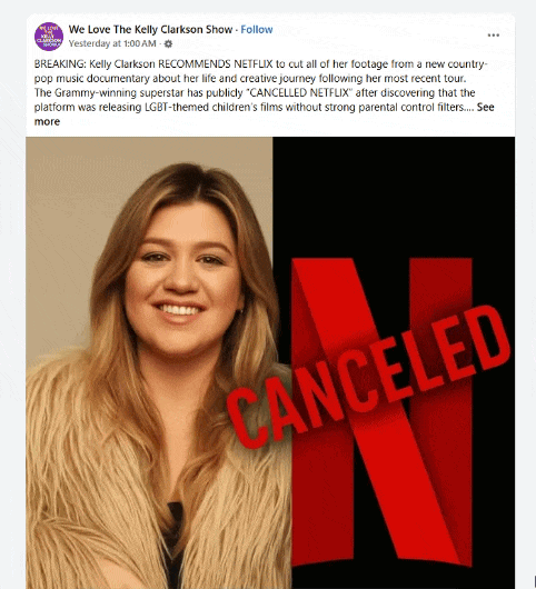 One example appeared in an October 29, 2025 post on Facebook account @AvrilUncovered (archived here) about singer Avril Lavigne. It opened with an image of Lavigne and a message: