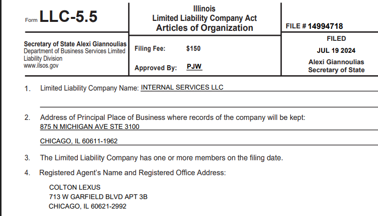 When he is not claiming to be homeless and begging for money, Lexus refers to himself as "Chief Lexus," sometimes wearing a star patch that resembles a law enforcement badge. He identified himself in the Nike video as "Colton Lexus here with internal Services LLC." We found that the company was registered with the Illinois secretary of state on July 19, 2024, with Colton Lexus listed as its registered agent.