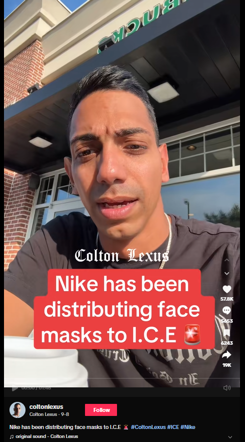 The claim originated in a video (archived here) published on the @coltonlexus TikTok channel on September 11, 2025, titled "Nike has been distributing face masks to I.C.E ???? #ColtonLexus #ICE #Nike." The video opened with a host saying: