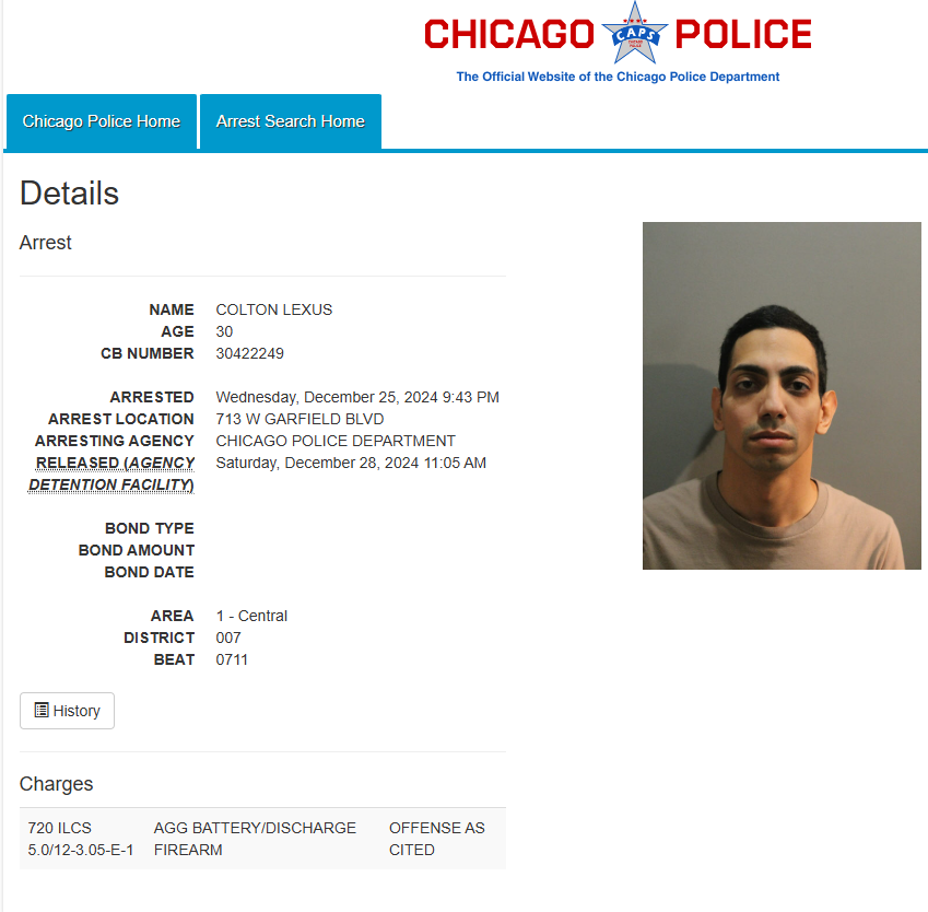 A news article (archived here), titled "Man arrested for shooting apartment door-kicker on Southwest Side, Chicago police say," reported that Lexus allegedly was inside his apartment when he fired at a man outside his apartment, seriously wounding him on Christmas Day: