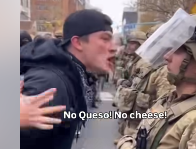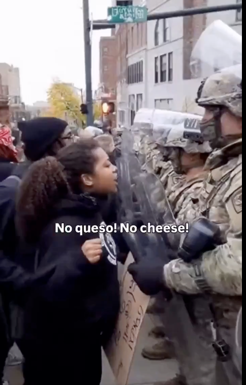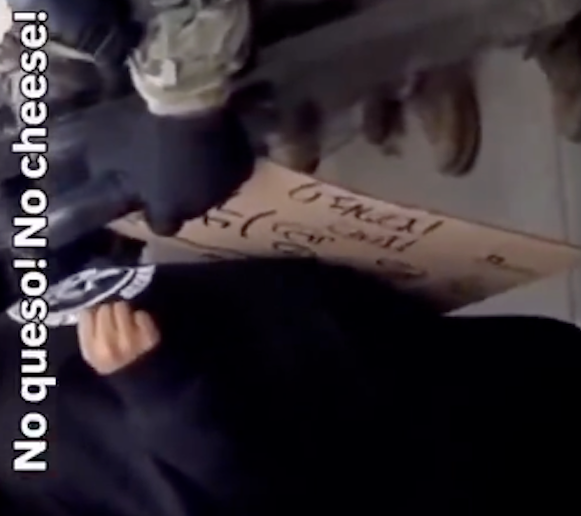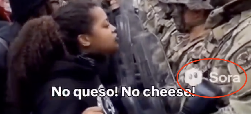 Does a viral video of a protester chanting "No queso! No cheese!" before being sprayed with orange-colored gas by law enforcement show a real-life scene? No, that's not true: A prominent watermark identified the video as having been generated by a specific AI tool. Visual artifacts indicate it was AI-generated, including faceless people in military fatigues and several examples of gibberish writing in a non-existent language.