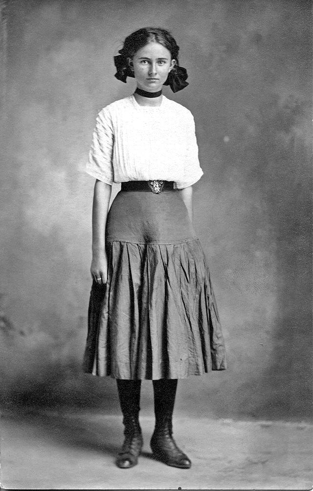 Is this a photo of the "Lady Ghost", a schoolteacher named Margaret Lee from Abilene, Kansas who killed five men, raiders, who in 1871 had killed twenty students when they burned the one-room schoolhouse? No, that's not true on two counts: This photo from 1912 shows thirteen-year-old Eva M. Lott, not a school teacher named Margaret Lee. There is no historical evidence of a schoolhouse fire in 1871 in Abilene or Dickinson County, Kansas, nor is there a legend of a "Lady Ghost" matching these social media posts' story about an avenging schoolteacher.