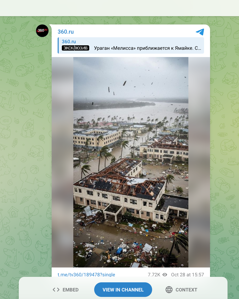 The image was posted on other social media accounts including a Russian Telegram post as Hurricane Melissa was heading toward Jamaica as this screenshot shows: