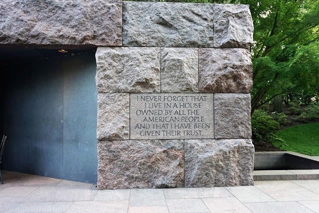 Was a plaque quoting President Franklin D. Roosevelt about "a house owned by all the American people" torn down by the demolition of the East Wing of the White House? No, that's not true: The FDR quote is engraved into a stone wall at the Franklin Delano Roosevelt Memorial. Tourists can find it in the first section of the "Second Term Room" of the memorial, which is next to the Washington, D.C., tidal basin, more than a mile from the White House.