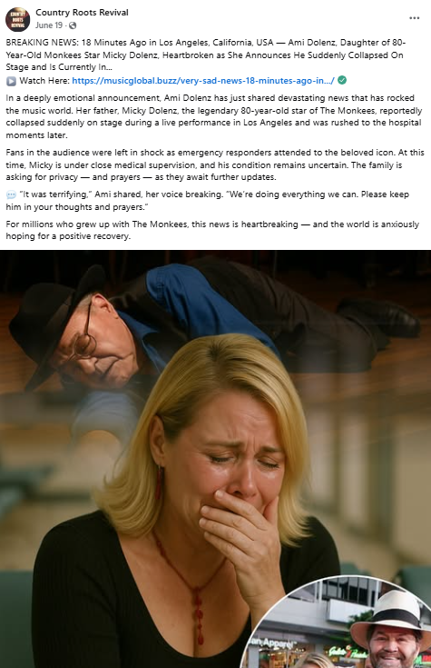 Four days later, on June 19, 2025, the same Facebook page shared more "BREAKING NEWS" about Dolenz. "Just 18 minutes ago," the post (archived here) read, his daughter "shared devastating news that has rocked the music world." The musician "collapsed suddenly on stage during a live performance in Los Angeles and was rushed to the hospital."