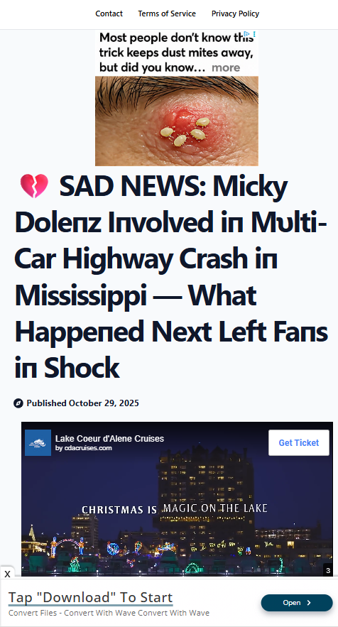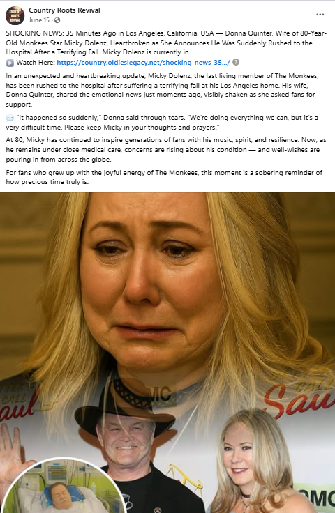 On July 8, 2025 - just 19 days after Micky's latest purported brush with death - the same Country Roots Revival page posted (archived here) more "BREAKING NEWS" that his wife had another tearful announcement. "27 Minutes Ago in Los Angeles, California, USA -- Donna Quinter, in Tears, Reveals That 80-Year-Old Micky Dolenz Was Rushed to the Hospital After a Tragic Accident Following His Visit to Texas Flood Victims."