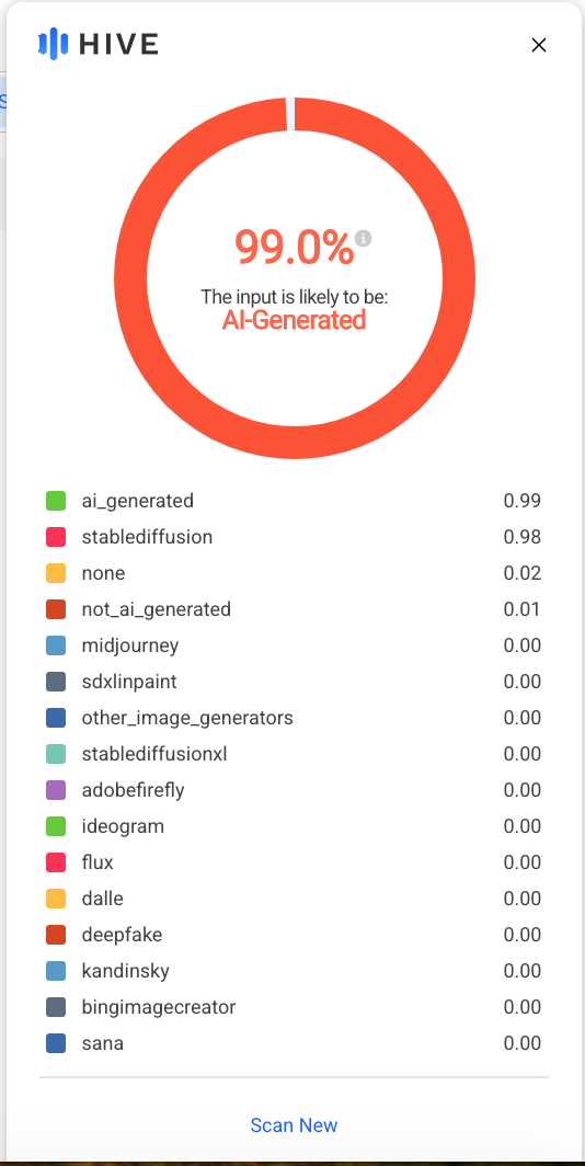 The AI detection tool Hive Moderation rated the image in the bio of the person standing in front of news cameras and appearing to be in a television station as 99 percent likely AI generated as this screenshot shows:
