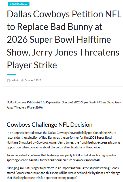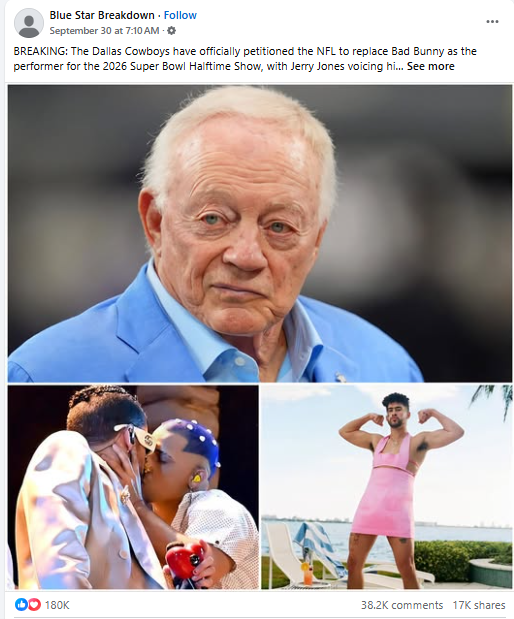 Did the Dallas Cowboys, Kansas City Chiefs, Cleveland Browns, Los Angeles Chargers, Green Bay Packers, Philadelphia Eagles, Denver Broncos, or any team, petition the NFL to replace Bad Bunny as the performer for the 2026 Super Bowl halftime show? No, that's not true: There have been no team announcements of such a demand, and no news media has reported on it. Similar false claims have been made about singer Bob Seger petitioning the NFL. The only source for the claims is a series of websites and Facebook sports fan pages operated out of Vietnam, following a pattern of false stories previously identified by Lead Stories.