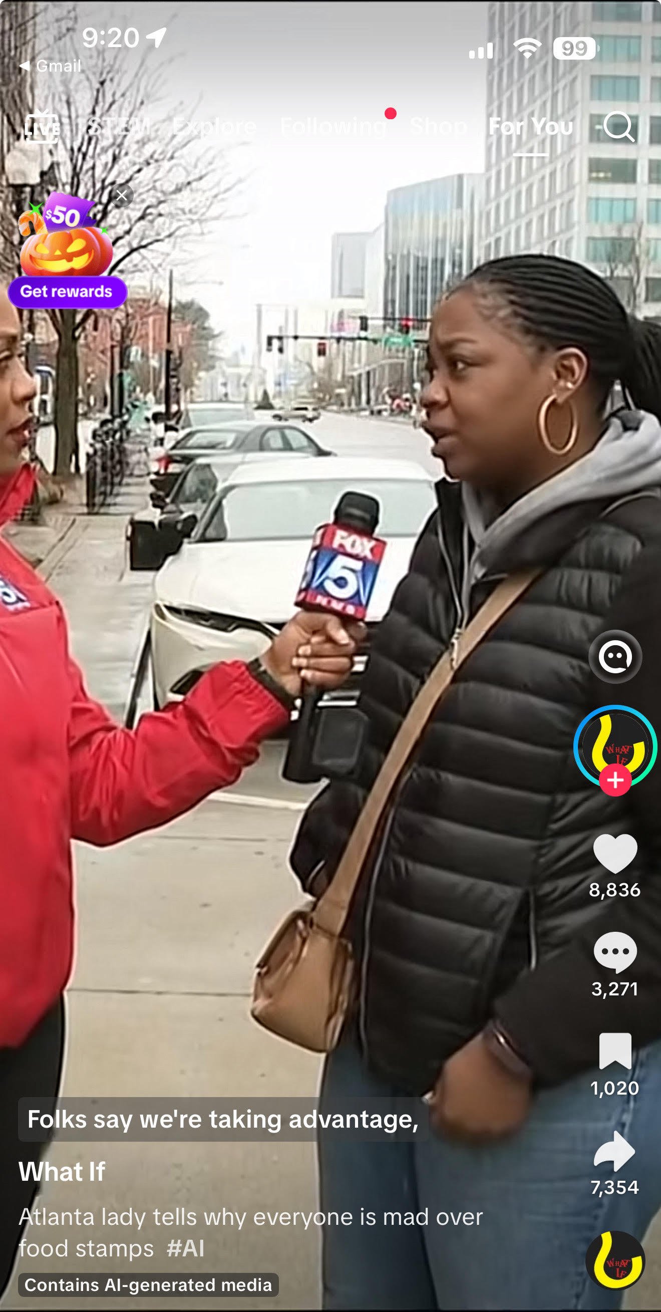Is a video of a lady in Atlanta telling a reporter that she sells $2,000 in SNAP food stamps each month for $1,200 authentic? No, that's not true: The video originated on a TikTok channel that acknowledges all of its content is AI-generated. The post includes "AI-generated" in the description of the video. The video does not exist on Atlanta's Fox 5 News website.