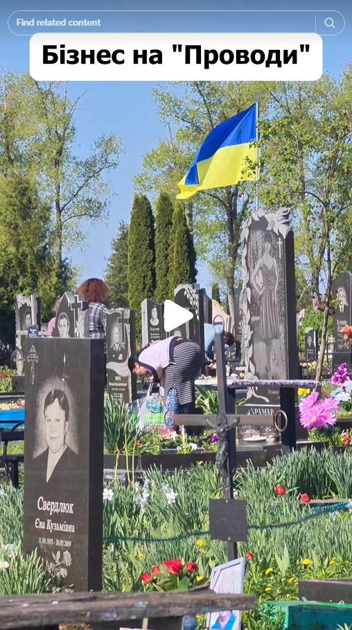 The original video was posted on TikTok (archived here) by a Ukrainian account, @djoni_game, on April 27, 2025. The video shows people collecting small bags from graves in a Ukrainian cemetery where a Ukrainian flag is visible (pictured below). The names on the gravestones are written in the Ukrainian alphabet derived from Cyrillic. The caption on the @djoni_game video, translated by Google translate, says: