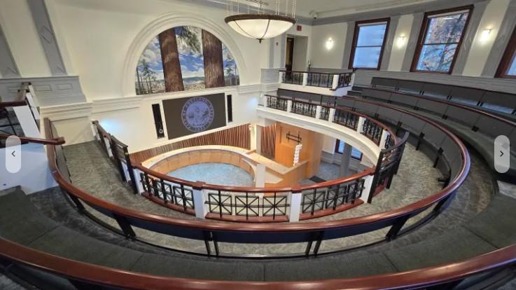 The city council chambers of Portland, Oregon were remodeled last year. A picture looking down from the balcony to the chamber floor (pictured below) was posted in a Dec. 13, 2024 koin.com article, "Portland City Council returning to remodeled City Hall".