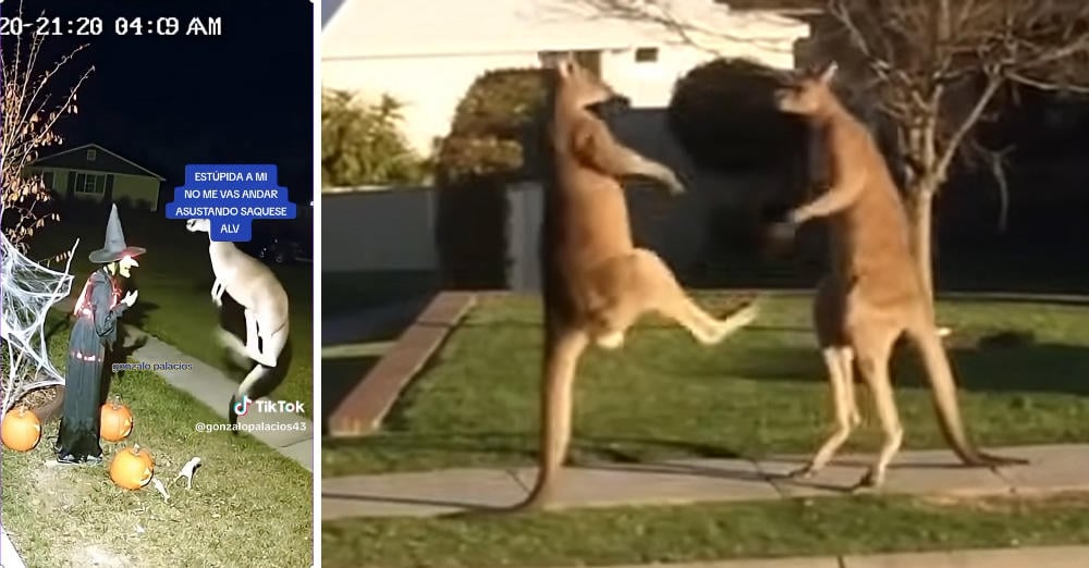 Did a kangaroo knock over a mechanical witch Halloween decoration with a powerful flying kick? No, that's not true: This video is AI-generated. When kangaroos kick out with both hind feet, they support themselves with their tail firmly on the ground.